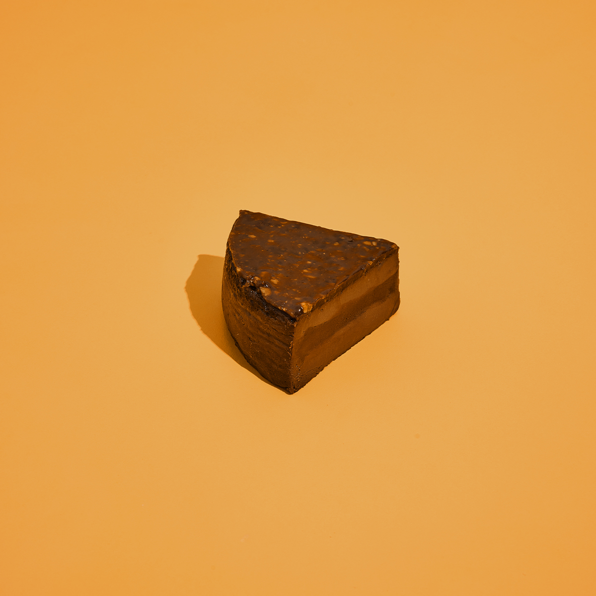 A rich Basque chocolate cheesecake featuring layers of velvety dark chocolate ganache and salted hazelnut praline, offering a truly indulgent chocolate experience.